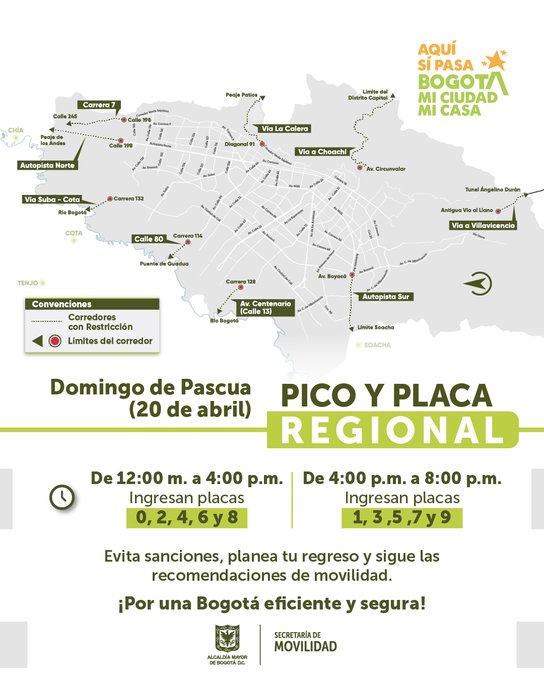🚘#MuéveteBienInformado en esta Semana Santa, porque el domingo de Resurrección 20 de abril, habrá #PicoYPlacaRegional:👇 🚫La restricción funciona así: 🔴De 12 m. a 4 p.m. solo ingresan placas PARES 🔴De 4 p.m. a 8 p.m. solo ingresan placas IMPARES