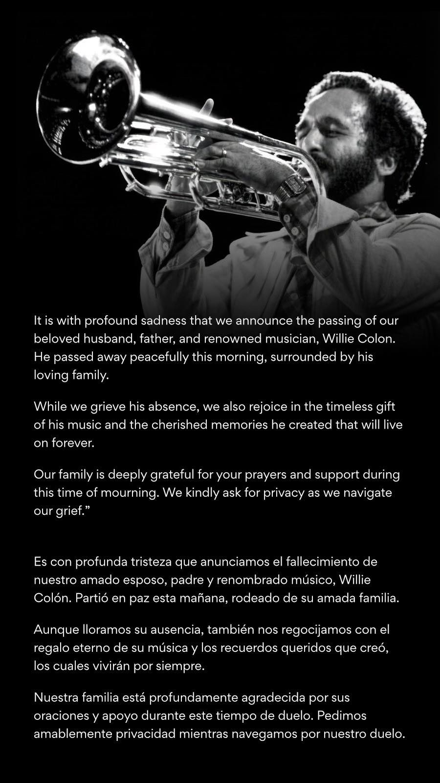 "Es con profunda tristeza que anunciamos el fallecimiento de nuestro amado esposo, padre y renombrado músico, Willie Colón. Partió en paz esta mañana, rodeado de su amada familia. Aunque lloramos su ausencia, también nos regocijamos con el regalo eterno de su música y los recuerdos queridos que creó, los cuales vivirán por siempre. Nuestra familia está profundamente agradecida por sus oraciones y apoyo durante este tiempo de duelo". Pedimos amablemente privacidad mientras navegamos por nuestro dolor.