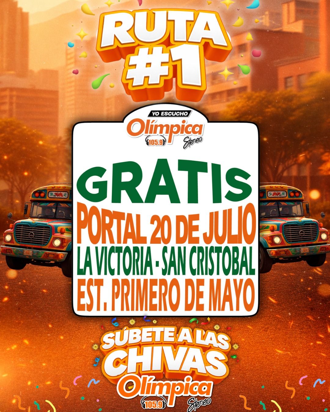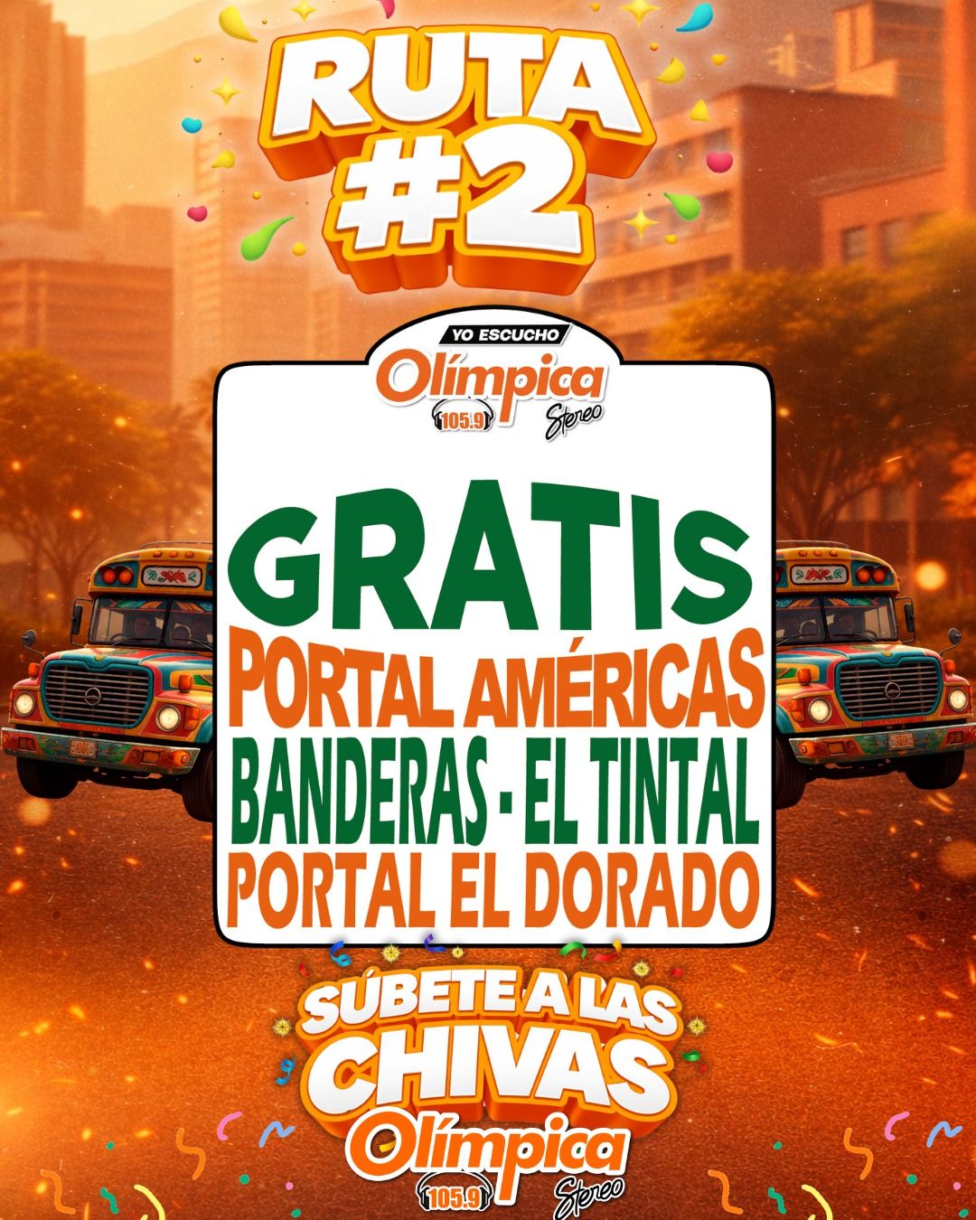 Para facilitar el transporte y ponerle sabor al madrugón, la emisora ha dispuesto dos rutas estratégicas de chivas que operarán de 6:00 a. m. a 10:00 a. m. y de 3:00 p. m. a 7:00 p. m.
