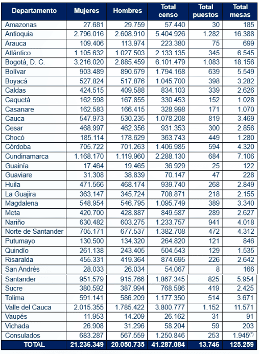 Las cifras del censo electoral para 2026 revelan un panorama de participación masiva, pues un total de 41.287.084 colombianos están habilitados para ejercer su derecho al voto. La logística para cubrir este potencial es monumental: la Registraduría instalará 125.259 mesas distribuidas en 13.746 puestos de votación.