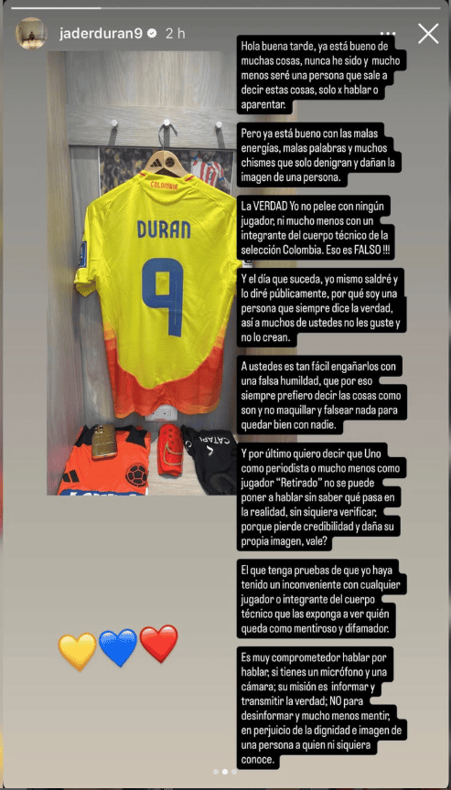 Durán desmintió cualquier pelea con compañeros o integrantes del cuerpo técnico, calificando las afirmaciones de Valderrama como "chismes que solo denigran y dañan la imagen".